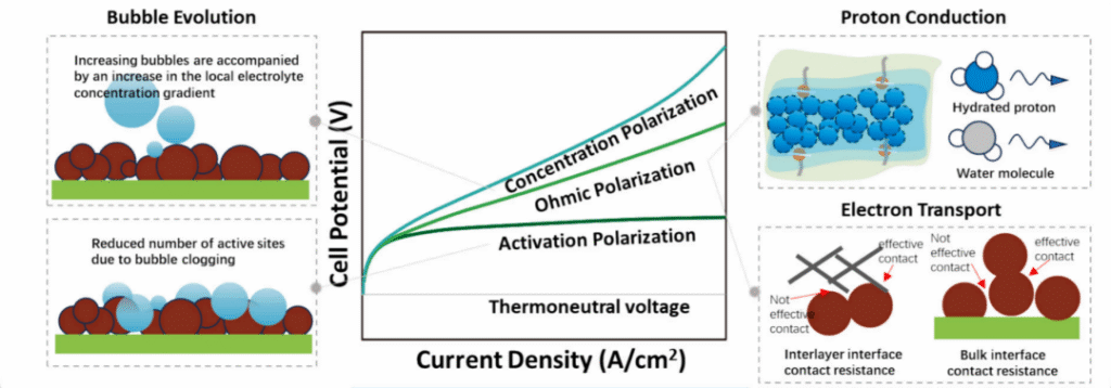 膜電極(MEA)作為質(zhì)子交換膜水電解技術(shù)的關(guān)鍵組件,是進行多相物質(zhì)傳輸和能量轉(zhuǎn)換的電化學(xué)反應(yīng)的核心場所。在MEA中,氣體(O2/H2)、液體(H2O)和固體(催化劑/離聚物)共存的復(fù)雜界面環(huán)境構(gòu)成了三相界面。質(zhì)子、電子、水分子與氣泡在三相界面上的協(xié)同傳輸至關(guān)重要,某一步的受阻都會造成“傳輸極化”,導(dǎo)致整體的電壓損失。這里的電壓損失可以拆解為活化極化(Activation Polarization)、歐姆極化(Ohmic Polarization)和濃差極化(Concentration Polarization),如圖1所示。在大電流密度下(例如2-3 A cm-2),由于大量的電子與質(zhì)子傳輸以及顯著的氣泡效應(yīng),導(dǎo)致電壓損失的主要因素不再是催化劑的活化能壘(活化極化),而是歐姆極化與濃差極化。本文詳細介紹歐姆極化的來源及降低策略。