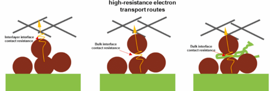 離聚物的含量和分布對體相的電子傳導(dǎo)有很大影響,電子傳導(dǎo)與質(zhì)子傳導(dǎo)的競爭關(guān)系使得需要對二者做出平衡。Mandal等人報道(ACS Appl Mater Interfaces 2020;12:49549-62.)在IrOx?催化層中(1 mgIr?cm-2),對歐姆電阻貢獻最大的是催化劑和離聚物的相對含量。當(dāng)離聚物含量低于15%時,會造成質(zhì)子傳導(dǎo)電阻,否則會造成電子傳導(dǎo)電阻。需要注意的是,以上研究是在Ir載量1 mg cm-2下進行的,隨著載量降低,催化層內(nèi)部、催化層與多孔傳輸層之間的接觸進一步減少,將會帶來更大的電子傳導(dǎo)電阻(圖3)。Rozain等人的研究表明IrO2載量對于性能的影響存在0.5 mg cm-2的閾值,在閾值以下,高頻電阻(HRF)會急劇增加、電解性能快速下降,需要添加導(dǎo)電性支撐物來保持催化層內(nèi)的良好傳導(dǎo)性與電化學(xué)活性(Applied Catalysis B: Environmental 182 (2016) 153-160)。