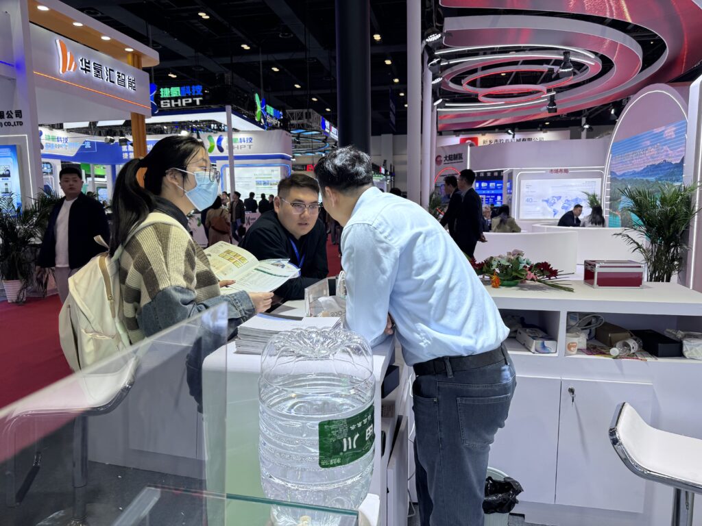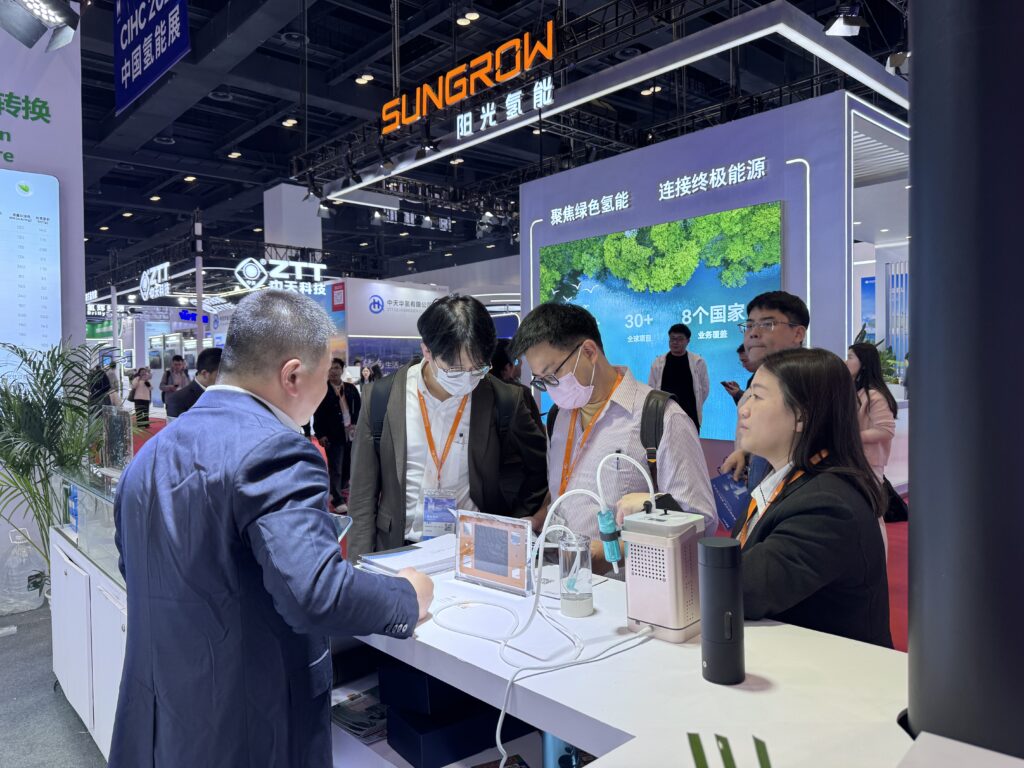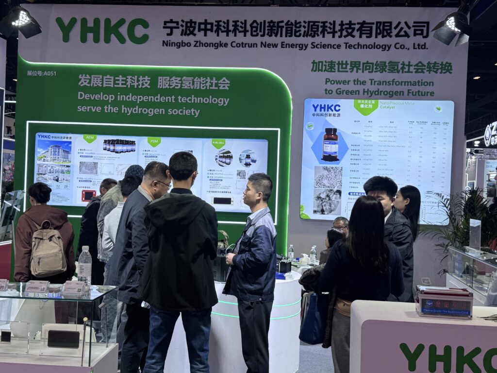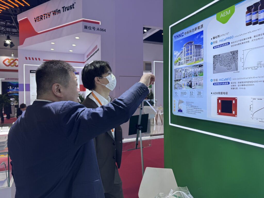 中科科創(chuàng)精心規(guī)劃了三個(gè)主題展區(qū)、一個(gè)中心聯(lián)合島臺(tái),全方位呈現(xiàn)在氫能領(lǐng)域取得的硬核技術(shù)成果,贏得國內(nèi)外行業(yè)客戶的高度關(guān)注與廣泛認(rèn)可。AEM電解水展示區(qū)人氣高漲,其中PtRu/C憑借卓越的催化活性與優(yōu)異的穩(wěn)定性成為展區(qū)核心亮點(diǎn)。PEM電解水展示區(qū)聚焦催化劑、膜電極以及相關(guān)配套產(chǎn)品,通過模塊化呈現(xiàn),凸顯產(chǎn)品在不同制氫場景中的超強(qiáng)適配能力。燃料電池展示區(qū)推出了全新的空冷燃料電池膜電極,該產(chǎn)品切入輕量化氫能兩輪車與無人飛機(jī)新賽道,以高可靠性與適配性吸引眾多行業(yè)目光。中心聯(lián)合島臺(tái)陳列中科科創(chuàng)0.6標(biāo)方電解槽,并邀請(qǐng)金科氫創(chuàng)、青島漢纜兩家友商聯(lián)合參展。其中,金科氫創(chuàng)的DMFC-50W高效直醇發(fā)電系統(tǒng)與青島漢纜的空冷燃料電堆,均搭載中科科創(chuàng)核心催化劑與膜電極產(chǎn)品。中心聯(lián)合島臺(tái)不僅構(gòu)建了行業(yè)協(xié)同展示平臺(tái),更直觀印證了中科科創(chuàng)核心產(chǎn)品的市場認(rèn)可度與應(yīng)用適配性。