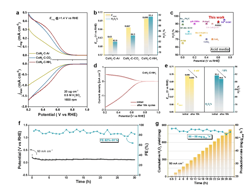 ? ? ? ? ? ? ? ? ? ? ? ? ? ? ? ? ? ? ? ? ? ? ? ? ? ? ? ? ? ? ? ? ? ? ? ? ? ? ? ? ? ? ? ? ? ? ? ? ? ? ? ? ? ? ? ?圖2. CoN4-C-Ar/CO2/NH3催化劑電催化2e ORR性能及流動池應用數(shù)據(jù)