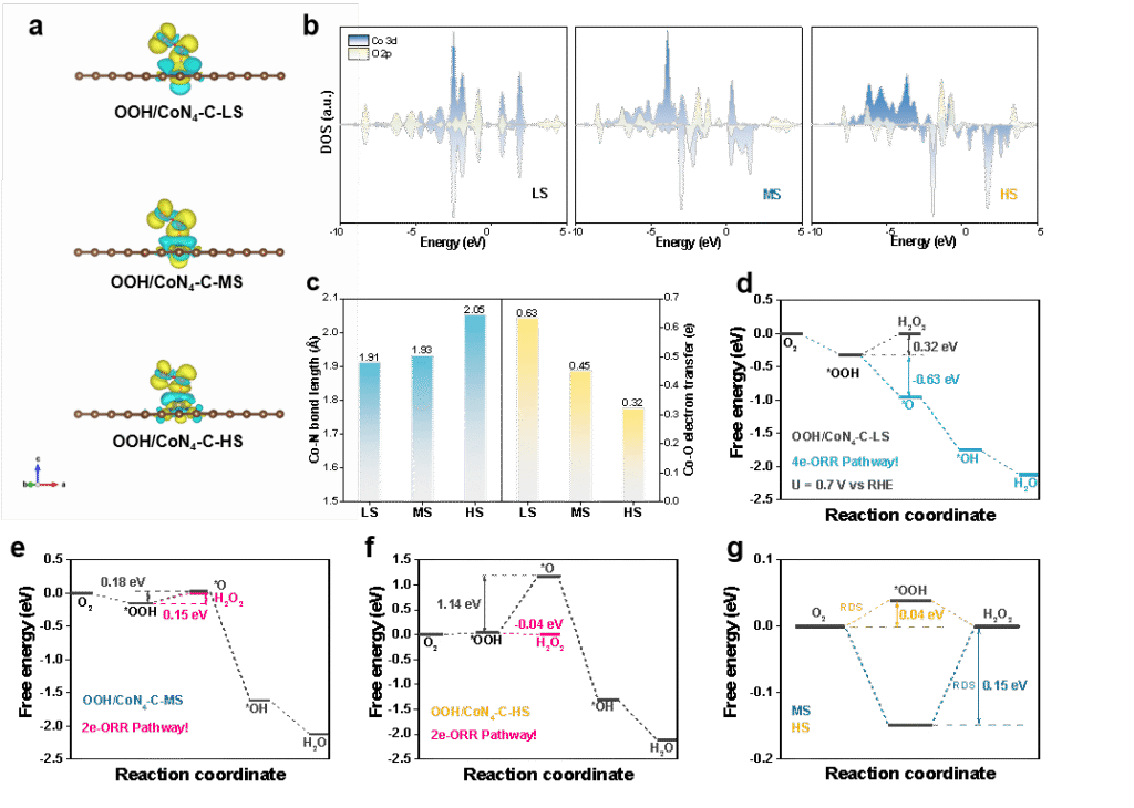 中科院上海高等研究院楊輝研究員團隊與寧波中科科創(chuàng)利用活性氣體對金屬原子的“拖拽效應”,拉長了Co原子與N原子的配位鍵長,誘導Co-3d軌道上電子的高自旋排布構(gòu)型,得到一種高自旋CoN4-C催化劑(CoN4-C-NH3)。CoN4-C-NH3解決了*OOH在傳統(tǒng)CoN4-C催化劑上吸附過強、2e ORR選擇性低的問題,展示出優(yōu)異的2e ORR電催化活性(0.698 V vs. RHE)與H2O2選擇性(91.4%),并在流動池應用中展現(xiàn)出極高的電流法拉第效率(91%)。相關成果以“Engineering spin state of CoN4-C single atom catalyst for acidic electrosynthesis of hydrogen peroxide”為題發(fā)表在Nano Energy上,論文第一作者是寧波中科科創(chuàng)朱艷萍博士。